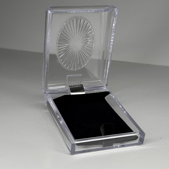 Versión más amplia del estuche tipo cristal, ideal para presentar juegos completos de joyería. Su diseño rígido y translúcido realza las piezas mientras las protege con elegancia.
