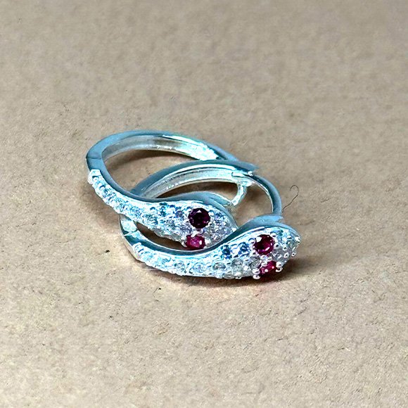 Elegantes aros plateados con forma de serpiente, adornados con circonitas blancas y piedras rojas. Perfectos para un toque audaz y brillante.